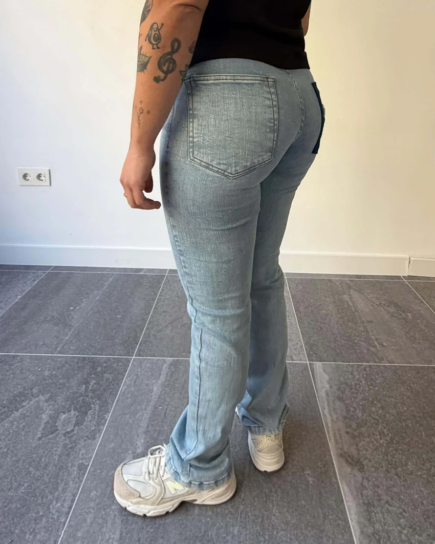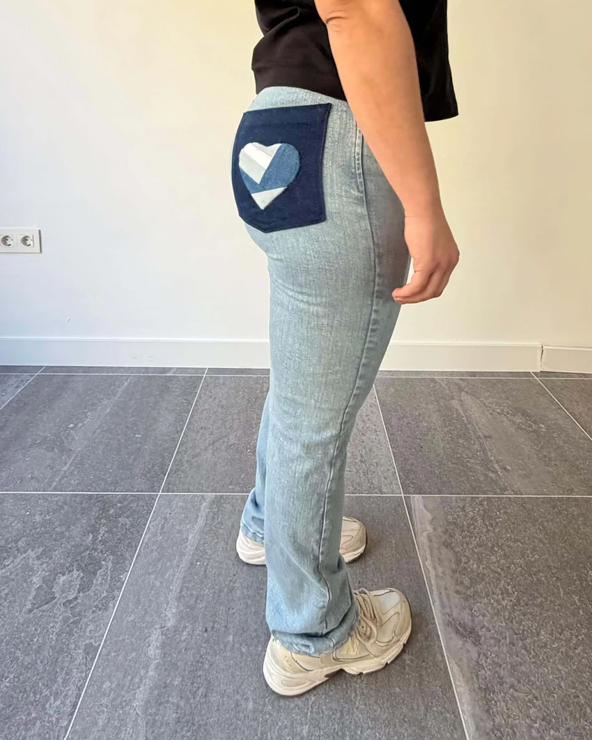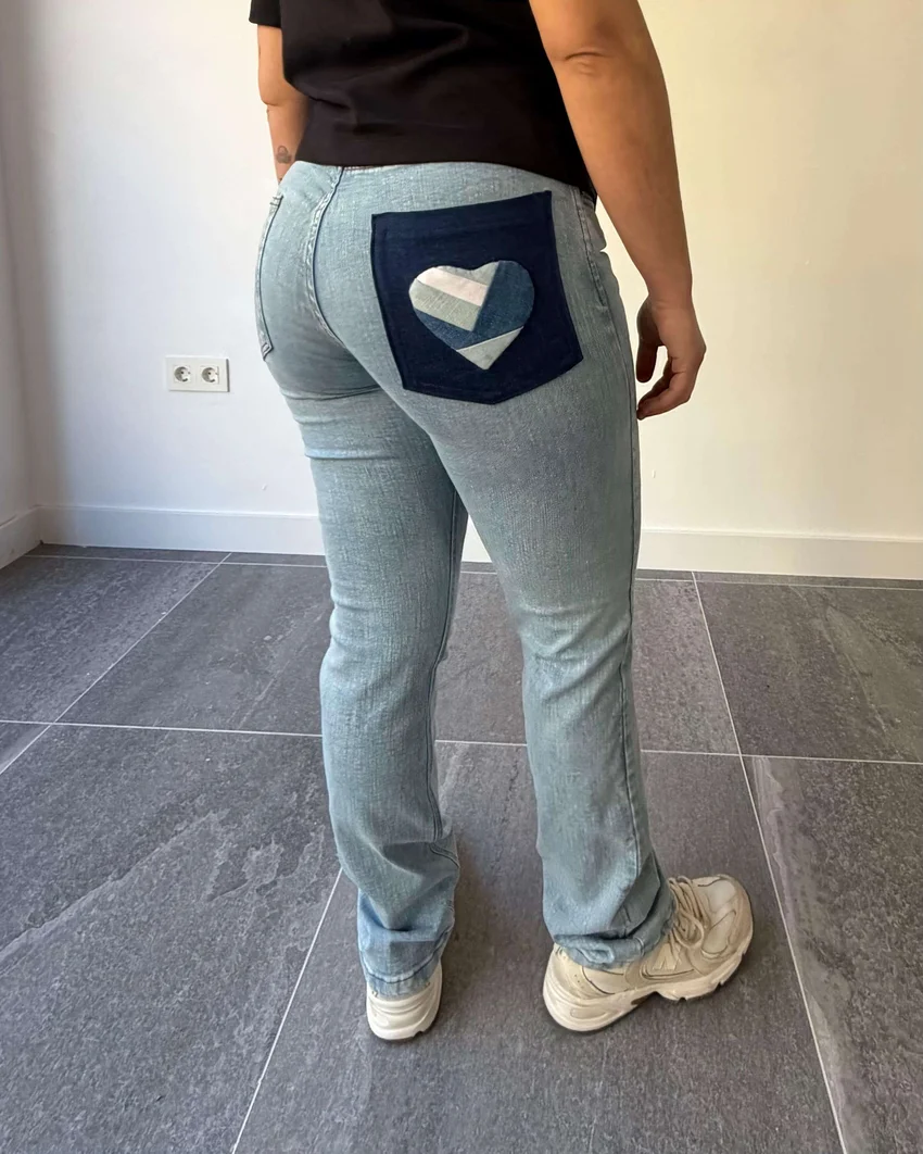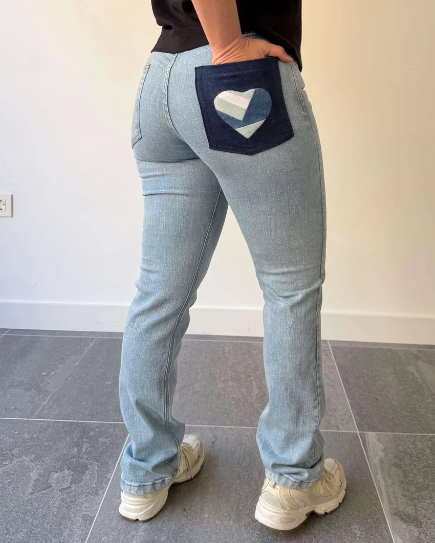 Pantalón corazon de mujer. Un diseño limpio con un detalle que marca la diferencia. El patchwork de rombos en el bolsillo trasero derecho convierte este vaquero recto en una prenda exclusiva. Hecho a mano desde cero y producido en España, sin producciones en serie.