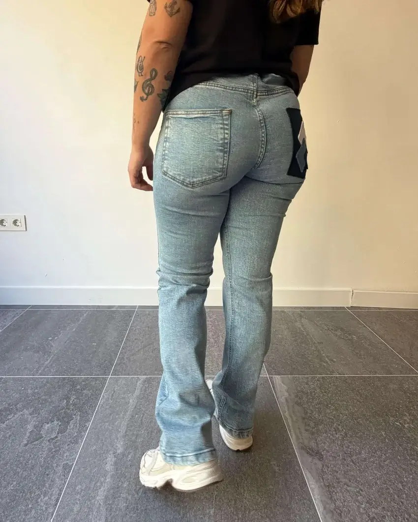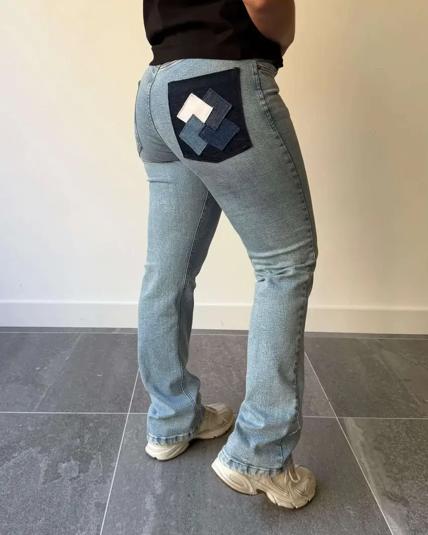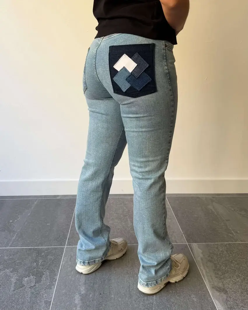 Pantalón rombos de mujer. Un diseño limpio con un detalle que marca la diferencia. El patchwork de rombos en el bolsillo trasero derecho convierte este vaquero recto en una prenda exclusiva. Hecho a mano desde cero y producido en España, sin producciones en serie.