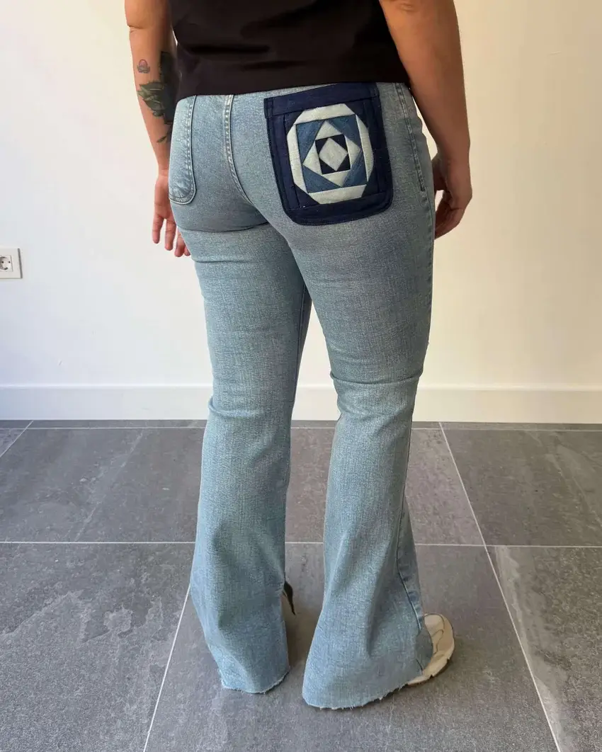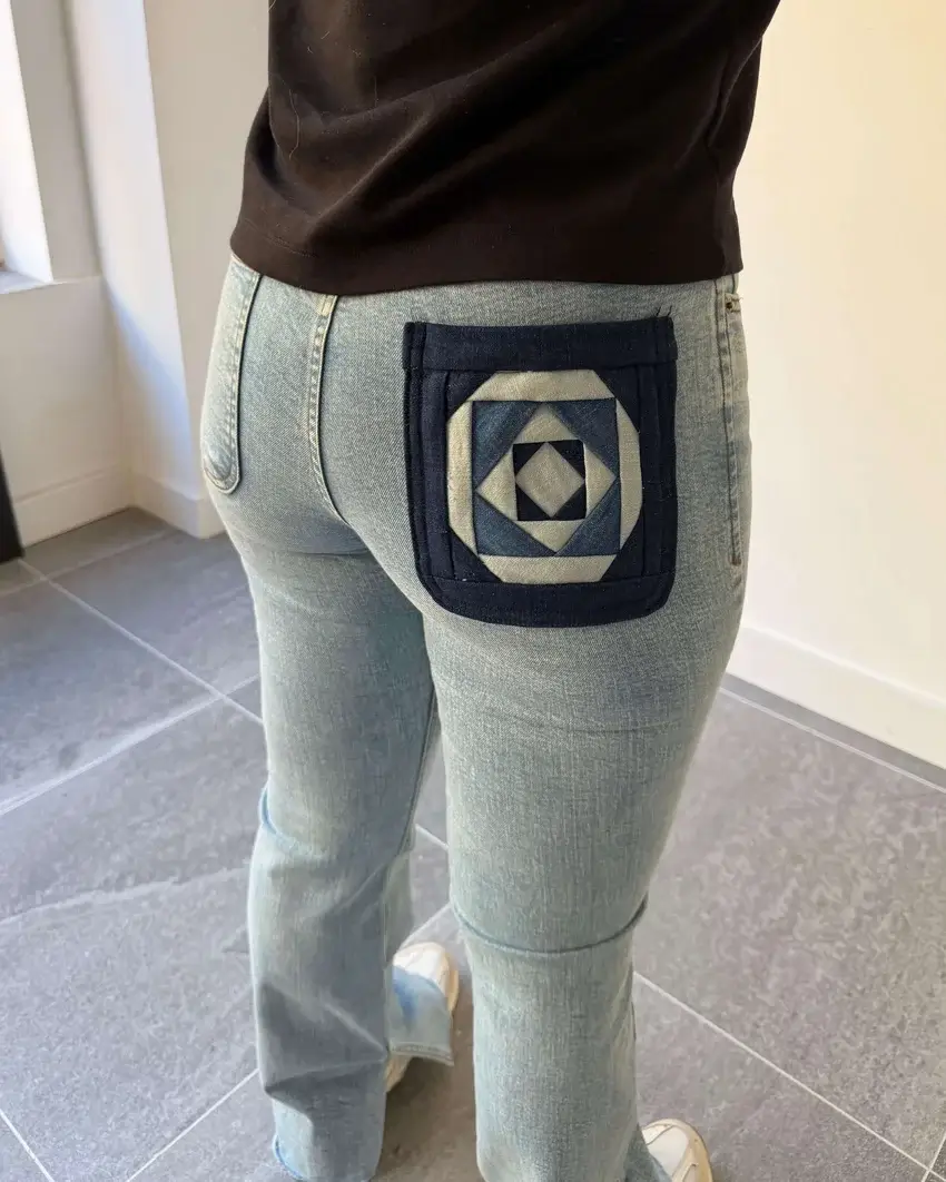 El bolsillo trasero derecho incorpora la técnica de patchwork Log Cabin, un guiño a la tradición textil reinterpretada desde una mirada contemporánea.