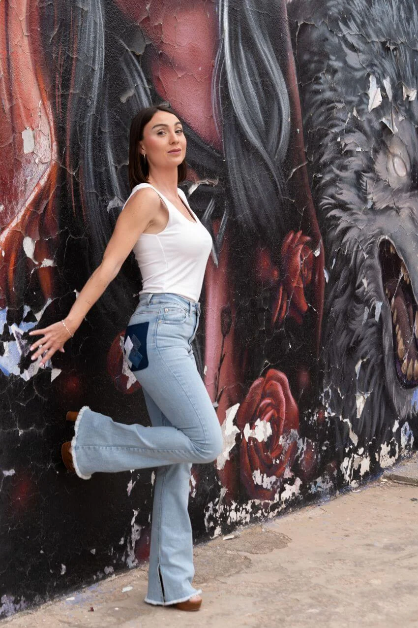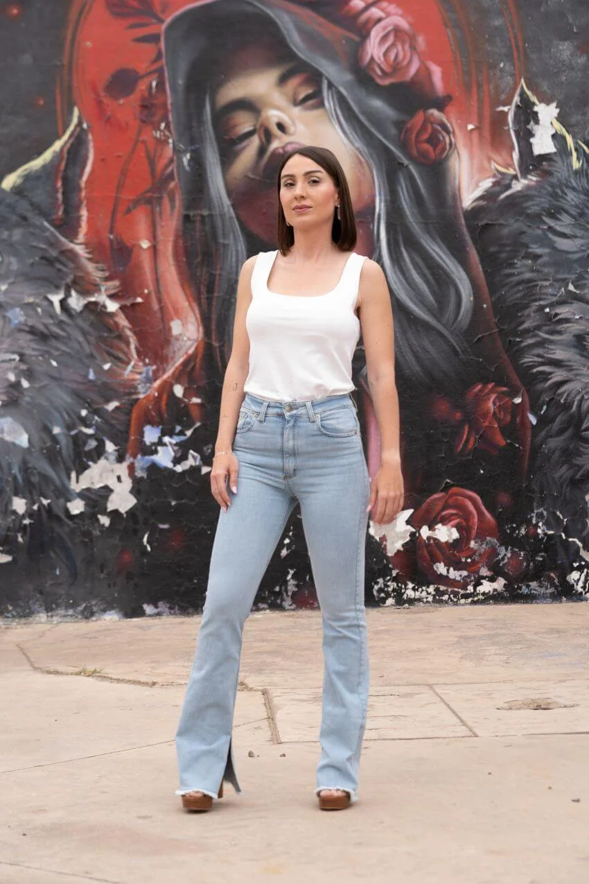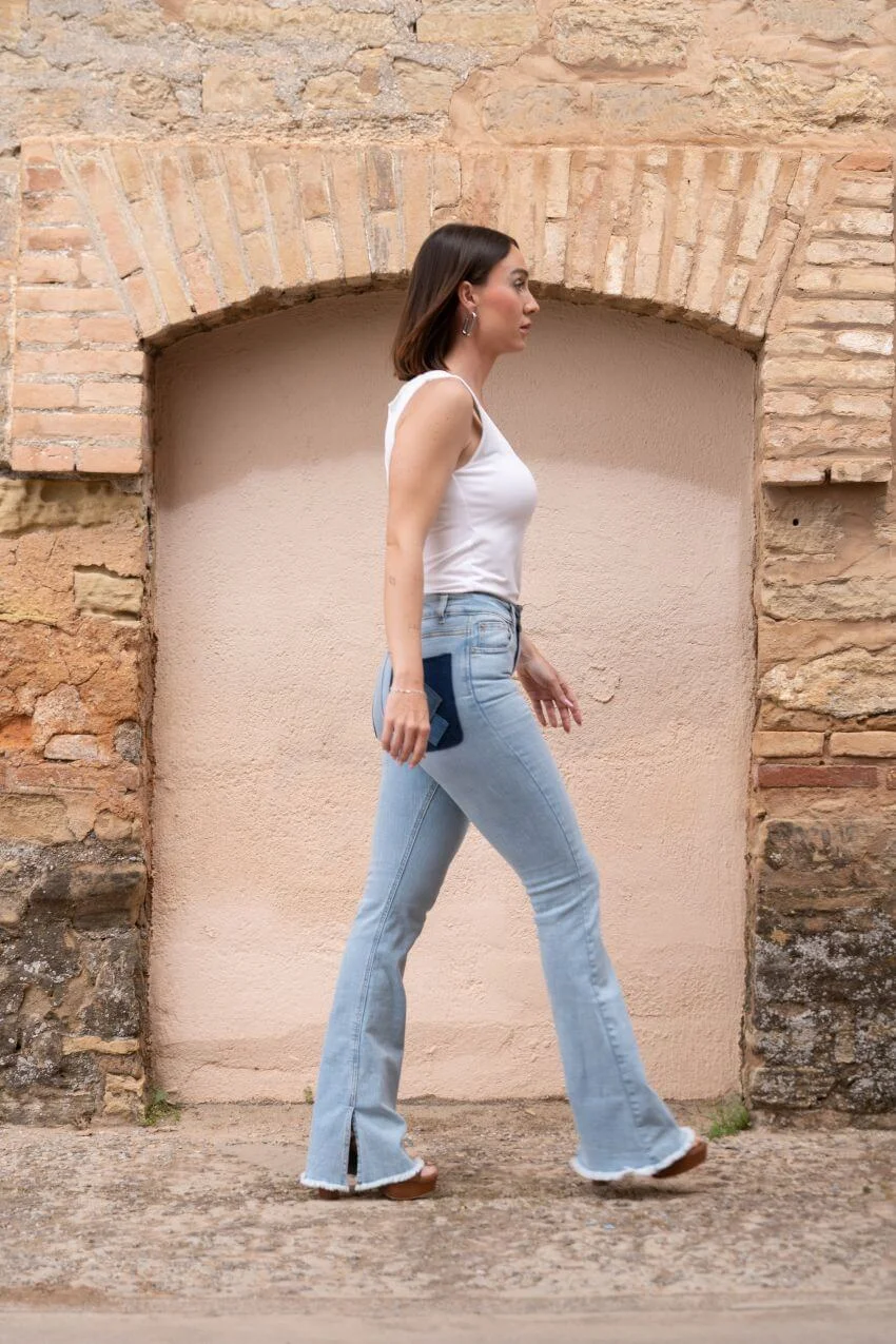 Pantalón vaquero campana con patrón rombos con un diseño geométrico con carácter propio. El patchwork de rombos en el bolsillo trasero derecho convierte este vaquero de campana en una prenda especial y diferente.