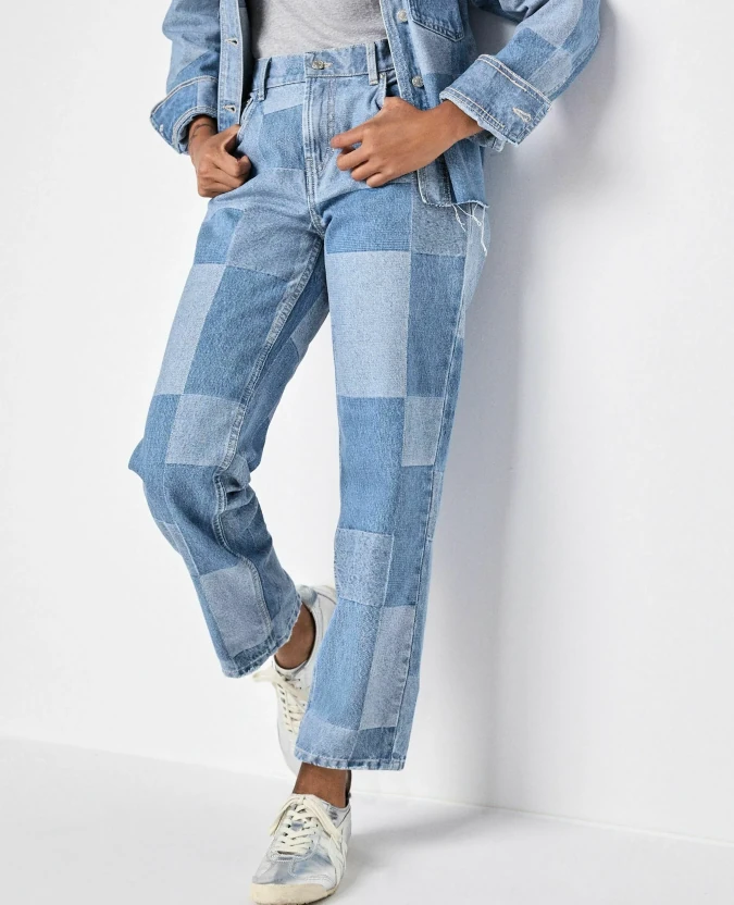 Pantalón vaquero recto Log Cabin. Corte recto, actitud atemporal. Este vaquero combina una silueta clásica con un toque diferencial: patchwork Log Cabin en el bolsillo trasero derecho.